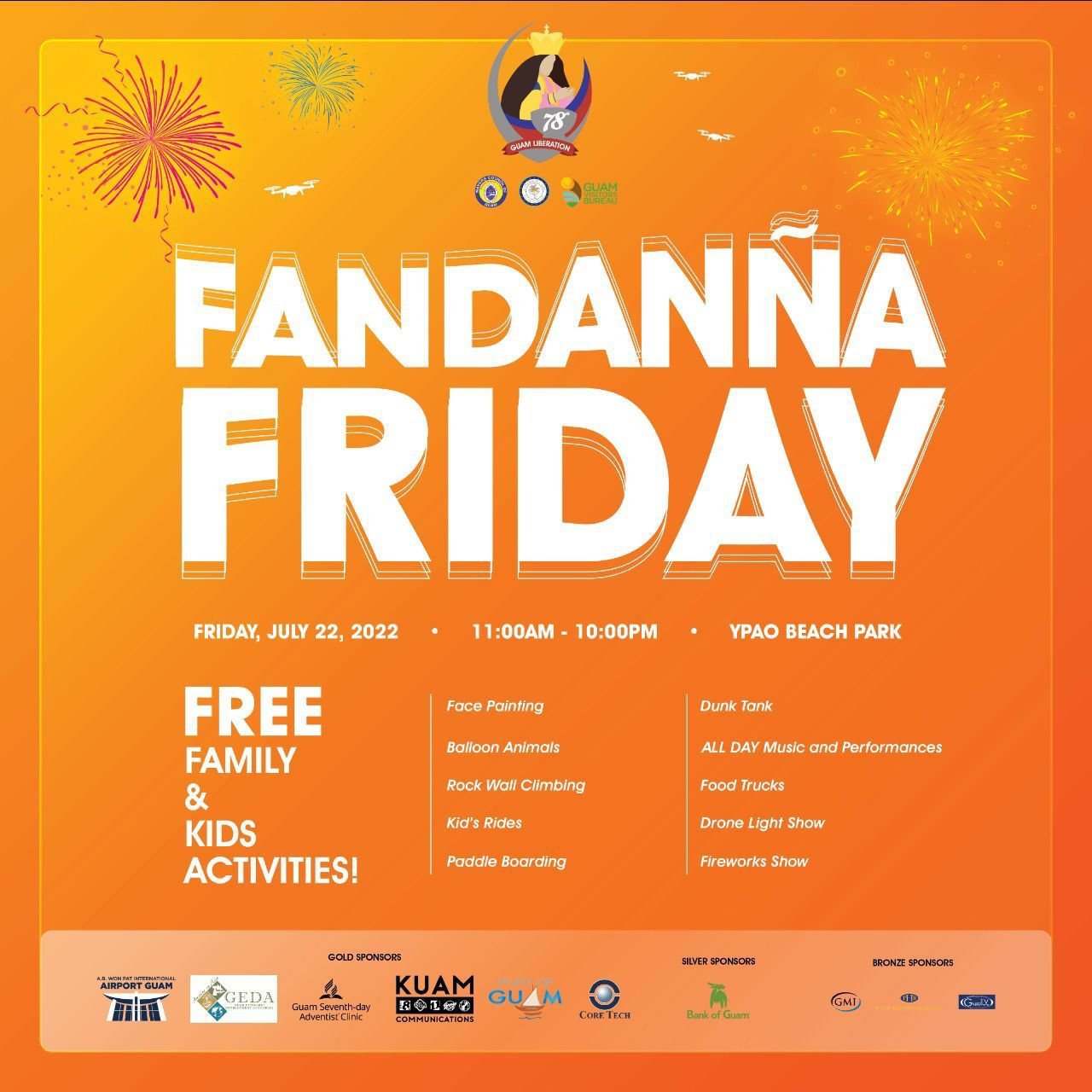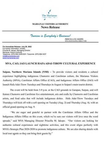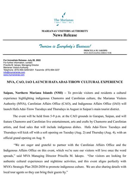 The Hafa Adai & Tirow Summer Jam offers the Battle of the Bands, with the best band performers from The Marianas and other live entertainment for visitors. In addition, it will also have local food vendors sell on the spot. a booth competition, Kids Fishing Derby, and other events. Live Band Entertainment for the people of the Marianas (Free Entrance). For more information, please contact the Marianas Visitors Authority at 1.670.664.3200/01 or email event coordinator Ed Diaz at ediaz@mymarianas.com.