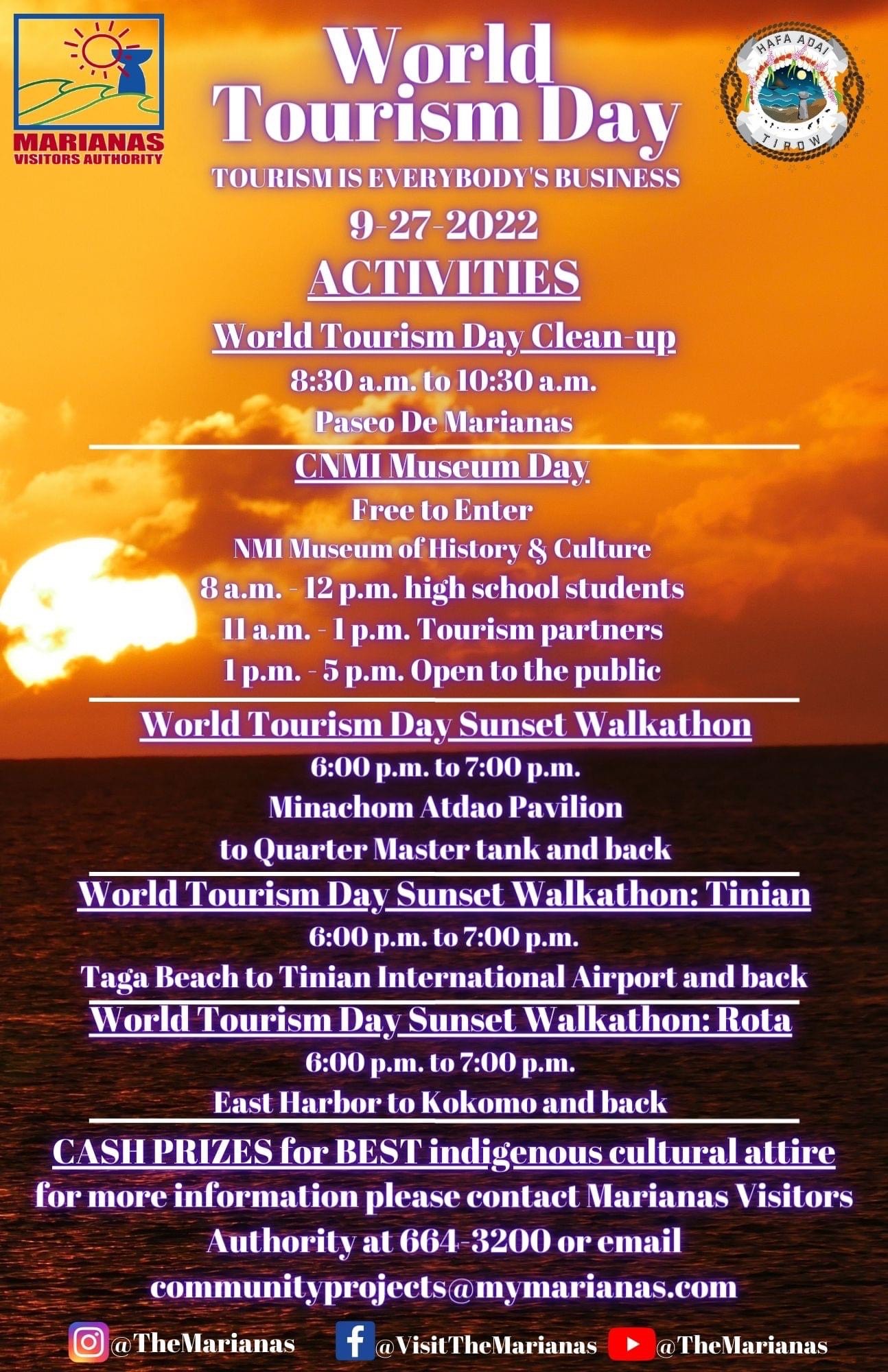We invite everyone to join our World Tourism Day Sunset Walkathons, cleanups, and other events scheduled on Rota, Tinian, and Saipan. Let's celebrate The Marianas #1 industry - tourism!