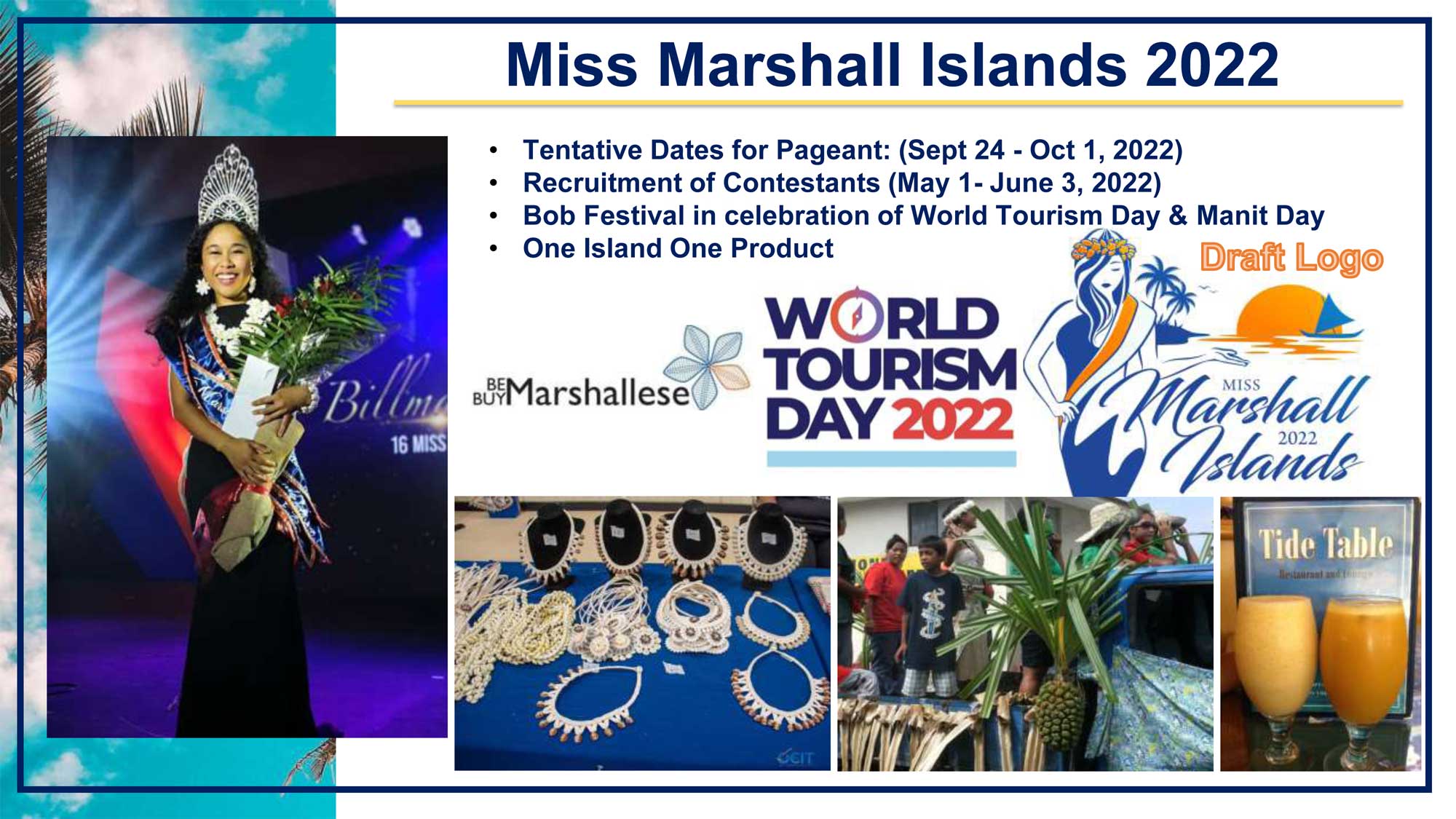 The Miss Marshall Islands Pageant 2022 (MMIP 2022), which was scheduled to take place from September 24 to October 1, 2022, has been postponed due to the rapid spread of COVID in the month of August,
