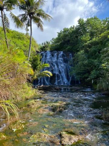 We hike down the southwestern savannah to a series of three large waterfalls on the Madofan River, then walk the beach to Facpi Point for spectacular views and head uphill through the jungle and up & out old jeep trails.