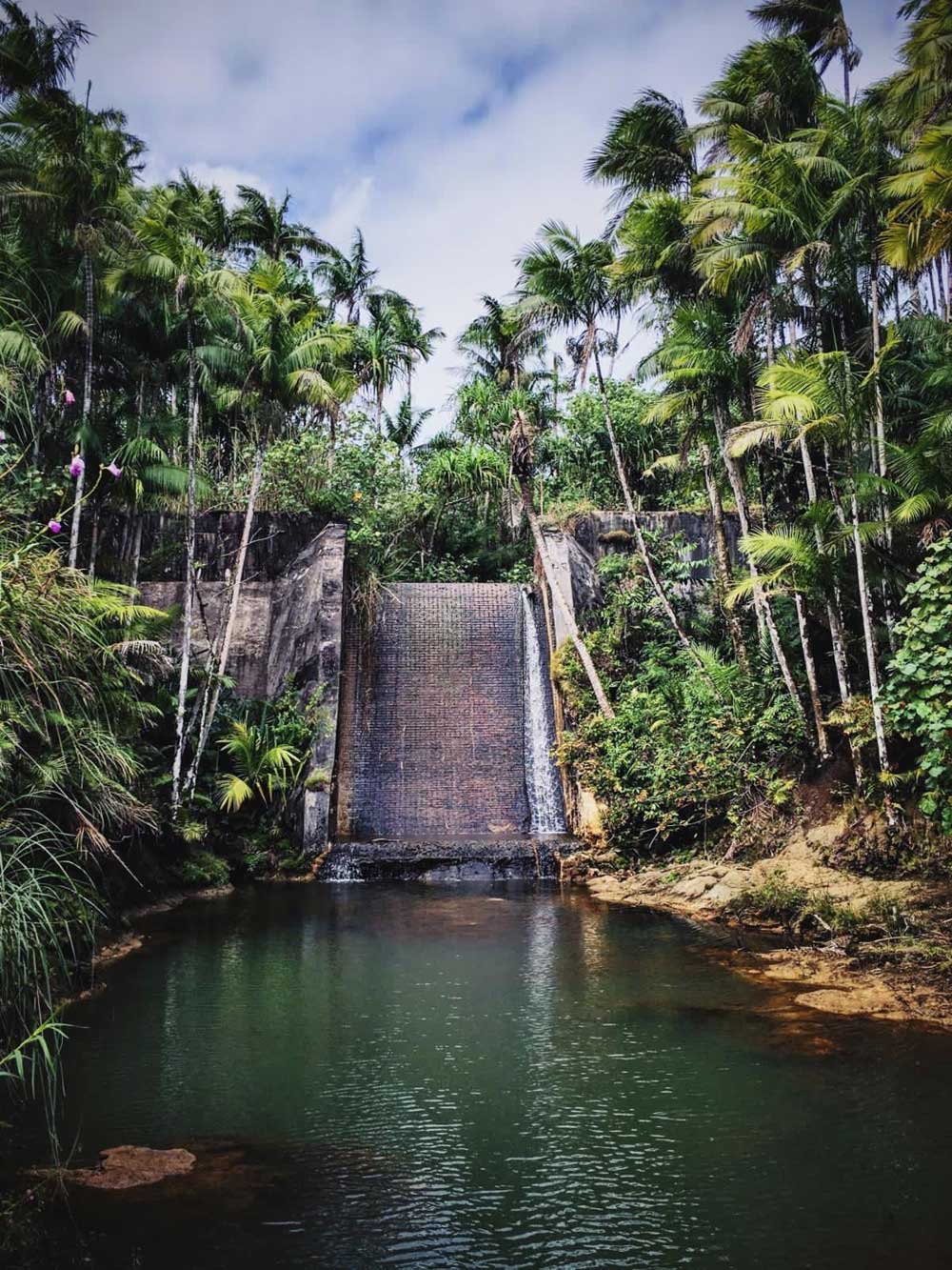 A gently sloping downhill trail, followed by a flat muddy patch, leads to the top of the large brick dam. Climbing down the steep trail beside the dam with the help of ropes we reach the bottom. Crossing the river we climb up the possibly muddy trail to the top of the other ridge. Coming out on an open windy ledge there is an outstanding view north towards the airport and beyond. A short but steep trail leads down to the river's edge and a short walk downstream, past the spider man challenge, leads to the swim hole and short jump at the small waterfall.