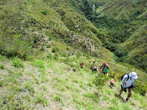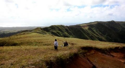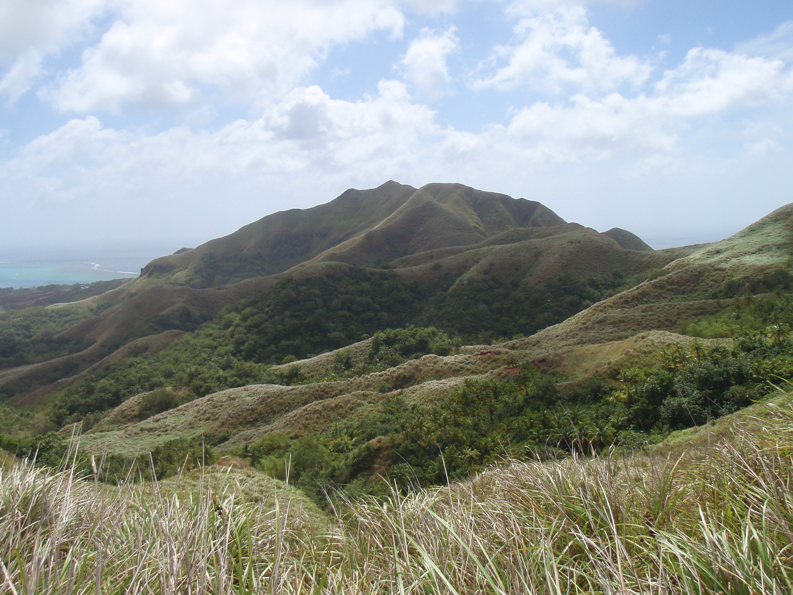 We hike down the narrow, open ridge, then over the two huge black rock hills with good views the whole way. We then head over gently rolling terrain to the coastline at the head of Cetti Bay, then south to Umatac for swimming and snorkeling. Bring 3 quarts water, good shoes, gloves, sun screen, insect repellent, lunch, camera, swimsuit, and snorkel gear. Special conditions: Very steep slopes, sword grass, little shade