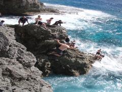 We offer two ways to get to the same place! We descend the cliff and through the limestone forest to explore the ocean arch with possible jumping and swimming, explore the ancient Chamorro village, then swim in the underground fresh water pool. Bring: 3 quarts water, hiking shoes, swim suit, flashlight, gloves, sun screen, insect repellent, lunch, and camera. Special conditions: Stretches of steep trail, walking in cave water and over rough limestone rocks.