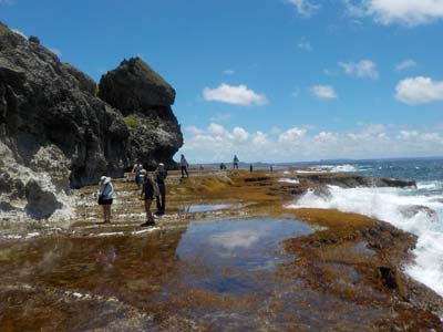 We hike from the black sand beach and Matala along the remote, beautiful, and rocky Asiga coastline, passing Nomna to reach Inarajan. There’ll be a few stops along the way to cool off in the water. Bring: 4 quarts water, hiking shoes that can get wet, swim suit, gloves, sun screen, sunglasses, lunch, and camera. Special conditions: Long stretches of walking in water, rough sharp rocks, no shade, and possible hazardous surf.