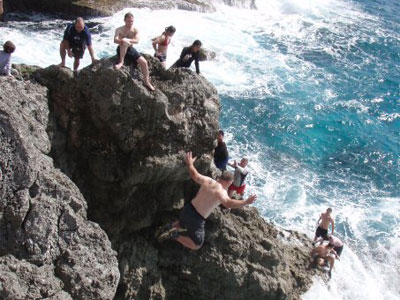 We descend the cliffs to visit the arch (jumping/swimming if conditions permit) ancient Chamorro village, and the underground swim pool. Bring: 3 quarts water, hiking shoes, swim suit, Flashlight, gloves, sun screen, insect repellent, lunch, and camera. Special conditions: Walking in cave water, and walking over rough limestone rocks, steep slopes.