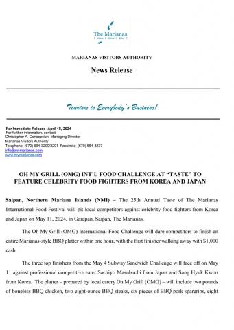 OH MY GRILL (OMG) INT’L FOOD CHALLENGE AT “TASTE” ON MAY 11 TO FEATURE KOREAN AND JAPANESE CELEBRITY EATERS